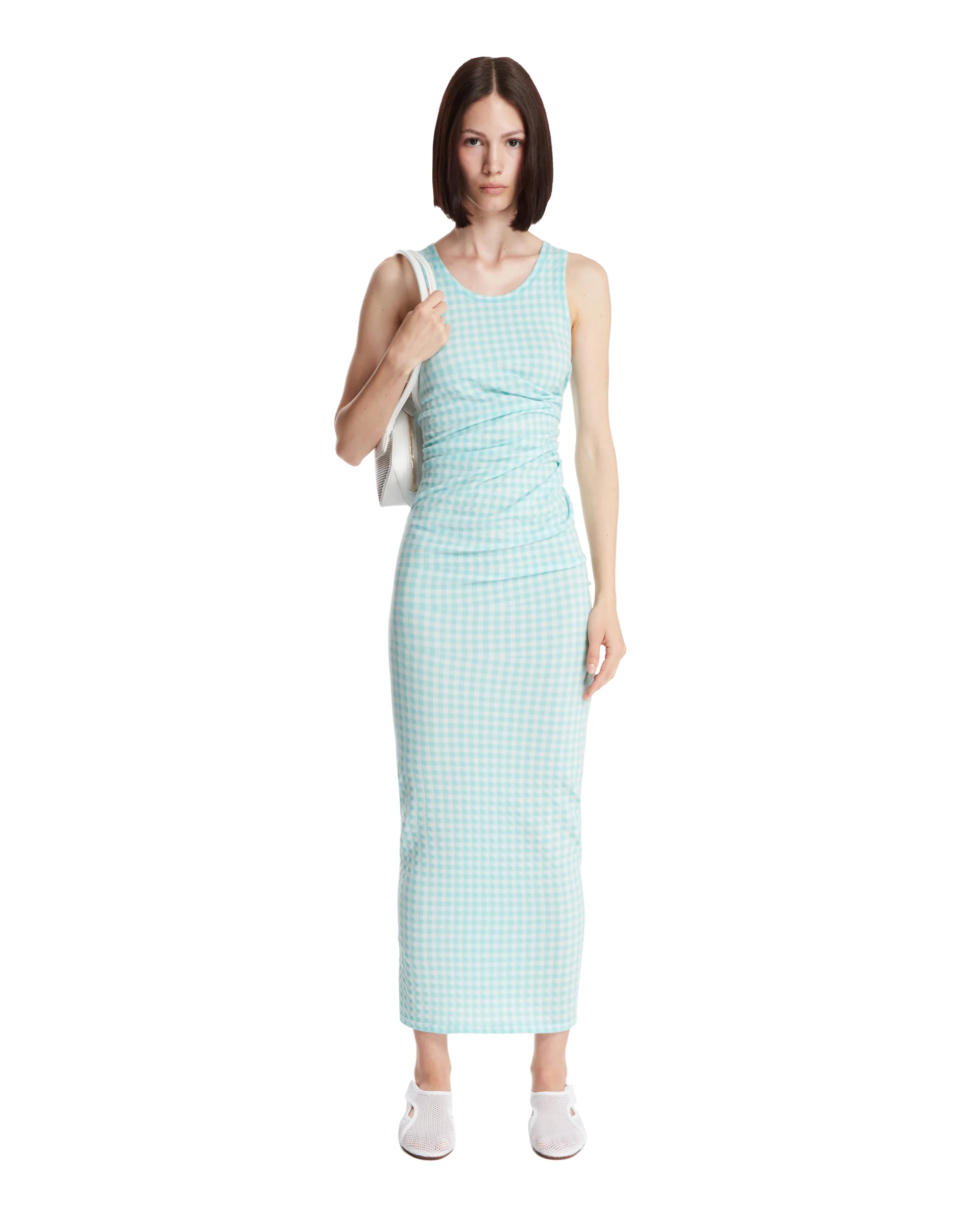 Abito Tank A Quadri Azzurro di Alaia. Realizzato in maglia a quadretti effetto seconda pelle bianco e azzurro, senza maniche, girocollo, lunghezza maxi. Alicia è alta 173 cm e indossa una 36.