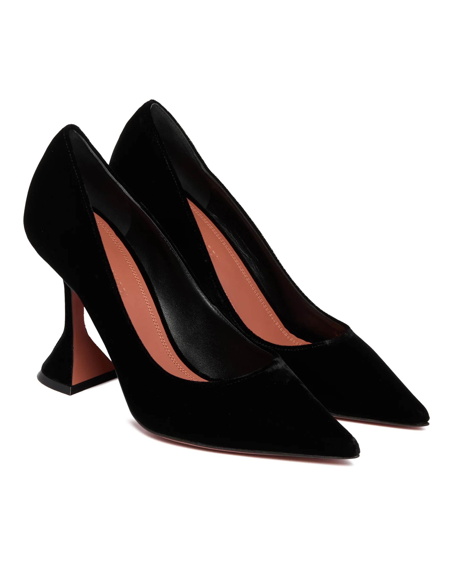 Decollete Ami Nere di Amina Muaddi. Tomaia in velluto nero. Design a punta, tacco a clessidra foderato alto, soletta logata, fodera in pelle, suola in cuoio e gomma. Altezza tacco: 9,5 cm