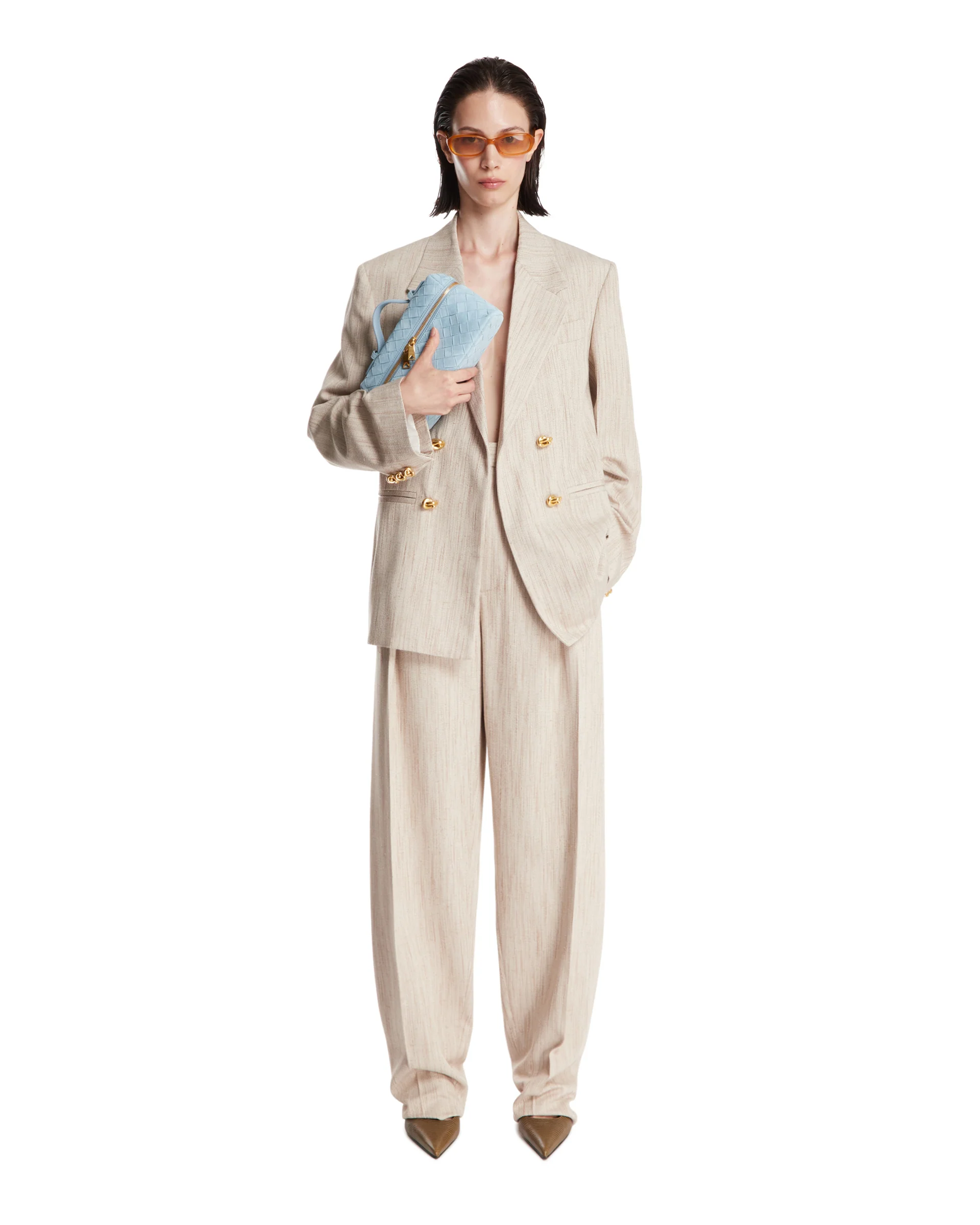 Pantaloni in seta e viscosa Beige di Bottega Veneta. Realizzati in misto seta e viscosa beige, Gamba affusolata, vita regolare, chiusura con zip, bottone e gancio. Passanti per cintura, modello a tre tasche. Vestibilità regolare. Alicia è alta 173 cm e indossa una 38.