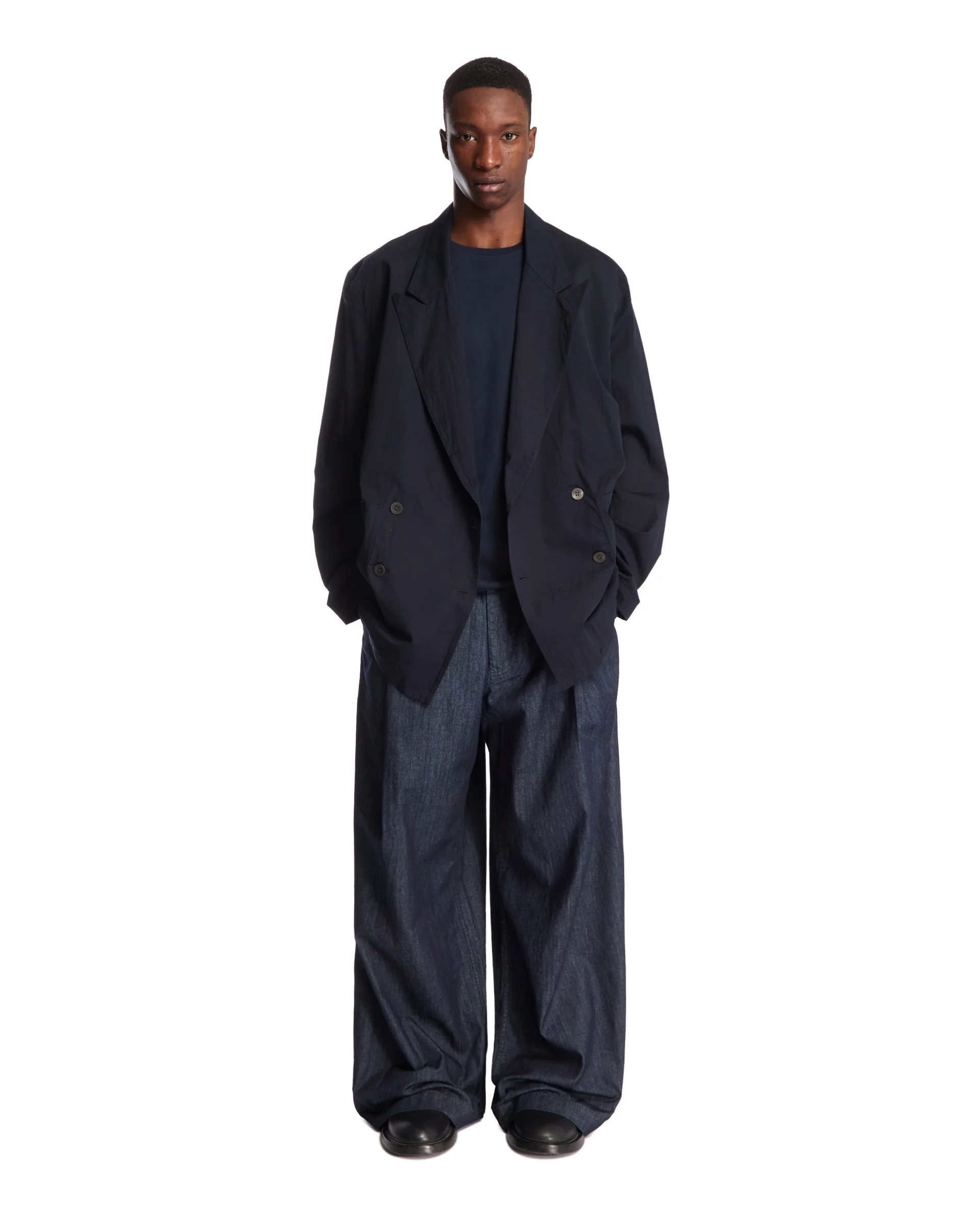 T-Shirt Girocollo Blu di Dries Van Noten. Realizzata in puro cotone blu. Girocollo, maniche corte, spalle basse, orlo dritto. Momo è alto 186 cm e indossa una XL.