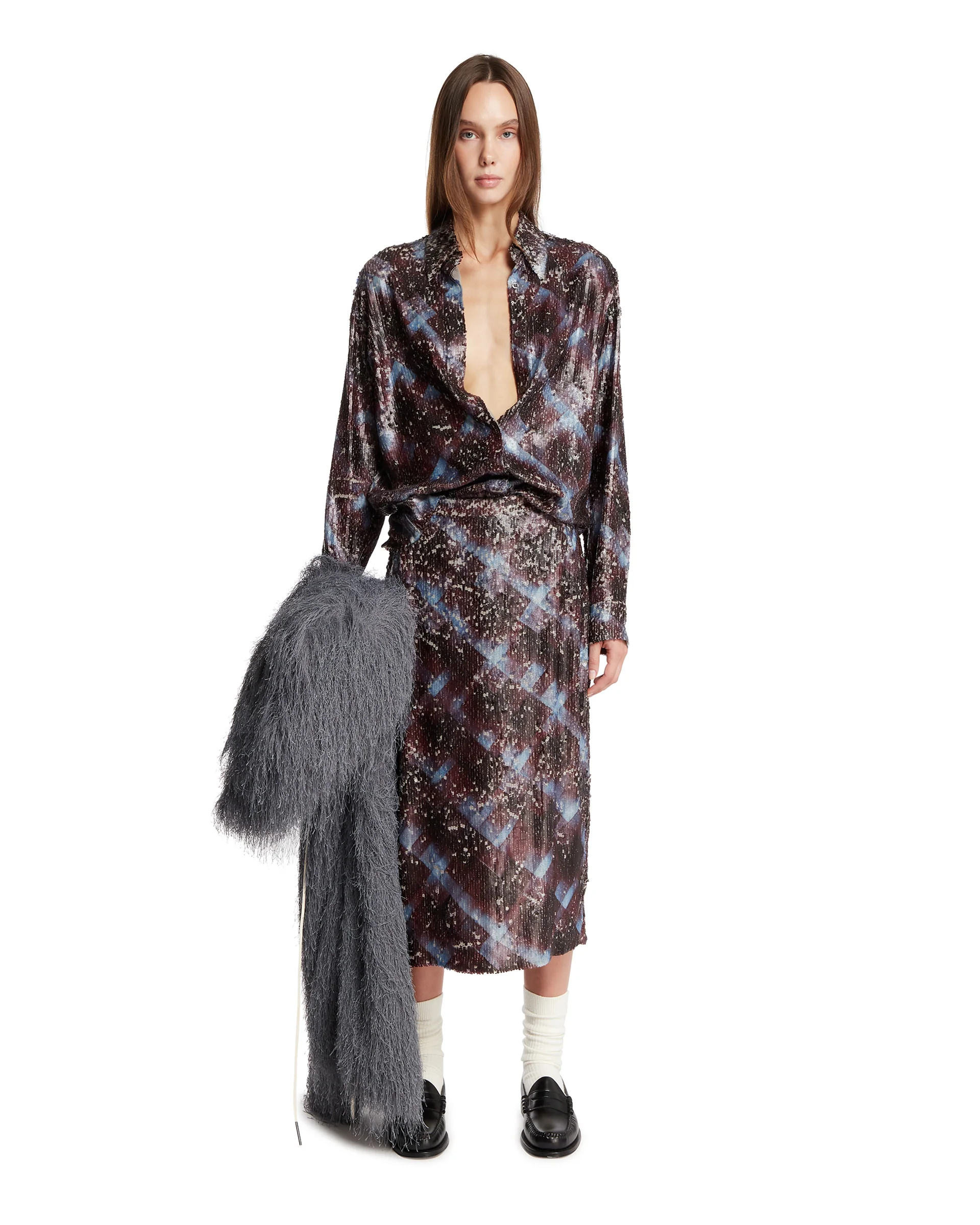 Gonna Con Strass Marrone di Dries Van Noten. Realizzata in viscosa marrone con strass effetto fantasia. Silhouette dritta, allacciatura con zip invisibile sul retro, orlo dritto. Daniele è alta 178 cm e indossa una 36.