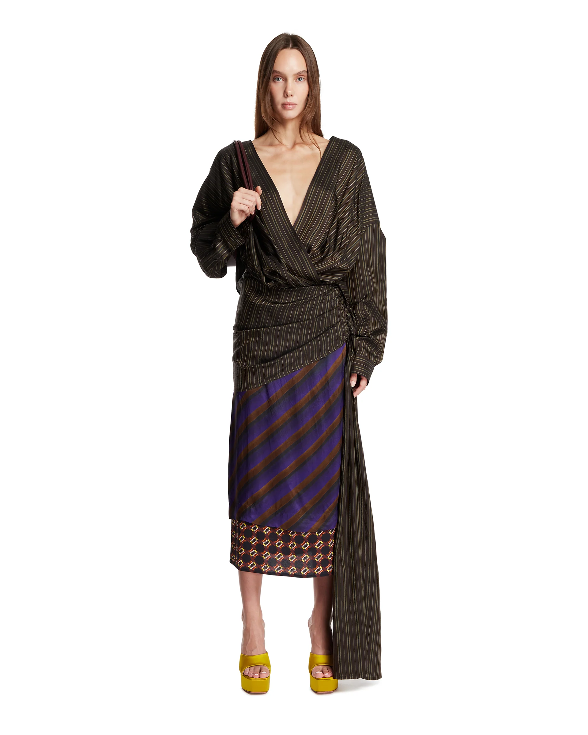 Gonna Drappeggiata Viola di Dries Van Noten. Realizzata in cupro, viscosa e seta viola con costruzione patchwork. Design drappeggiato, maxi fuschiacca laterale, chiusura nascosta sul fianco, orlo dritto. Daniele è alta 178 cm e indossa una 36.
