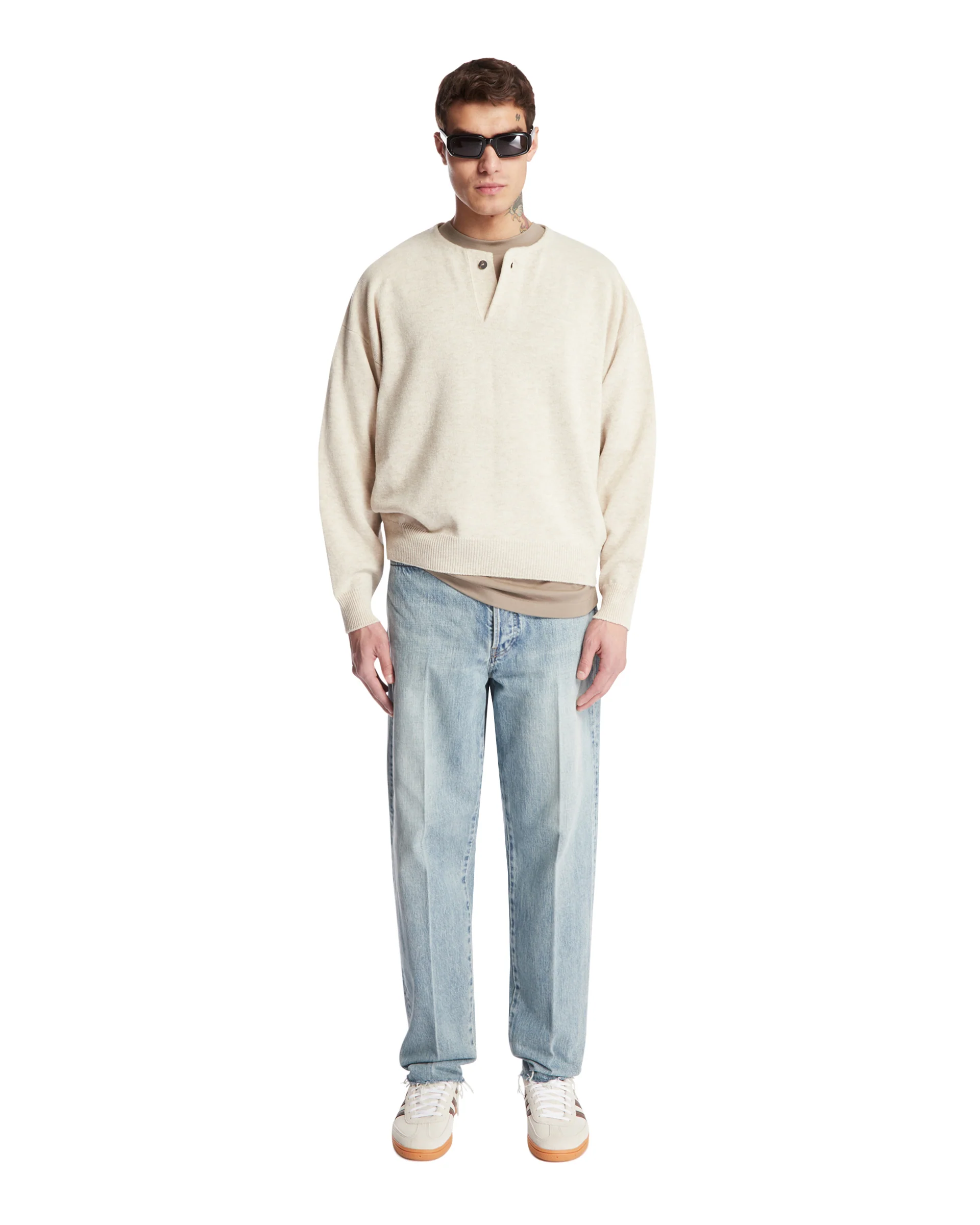 Jeans Con Pieghe Blu di Fear Of God. Realizzati in denim di puro cotone blu effetto vissuto. Chiusura nascosta frontale con bottone visibile, passanti per cintura, pieghe stirate, struttura cinque tasche, iconica etichetta logata sul davanti, orlo dritto sfrangiato. Leandro è alto 187 cm e indossa una 31.