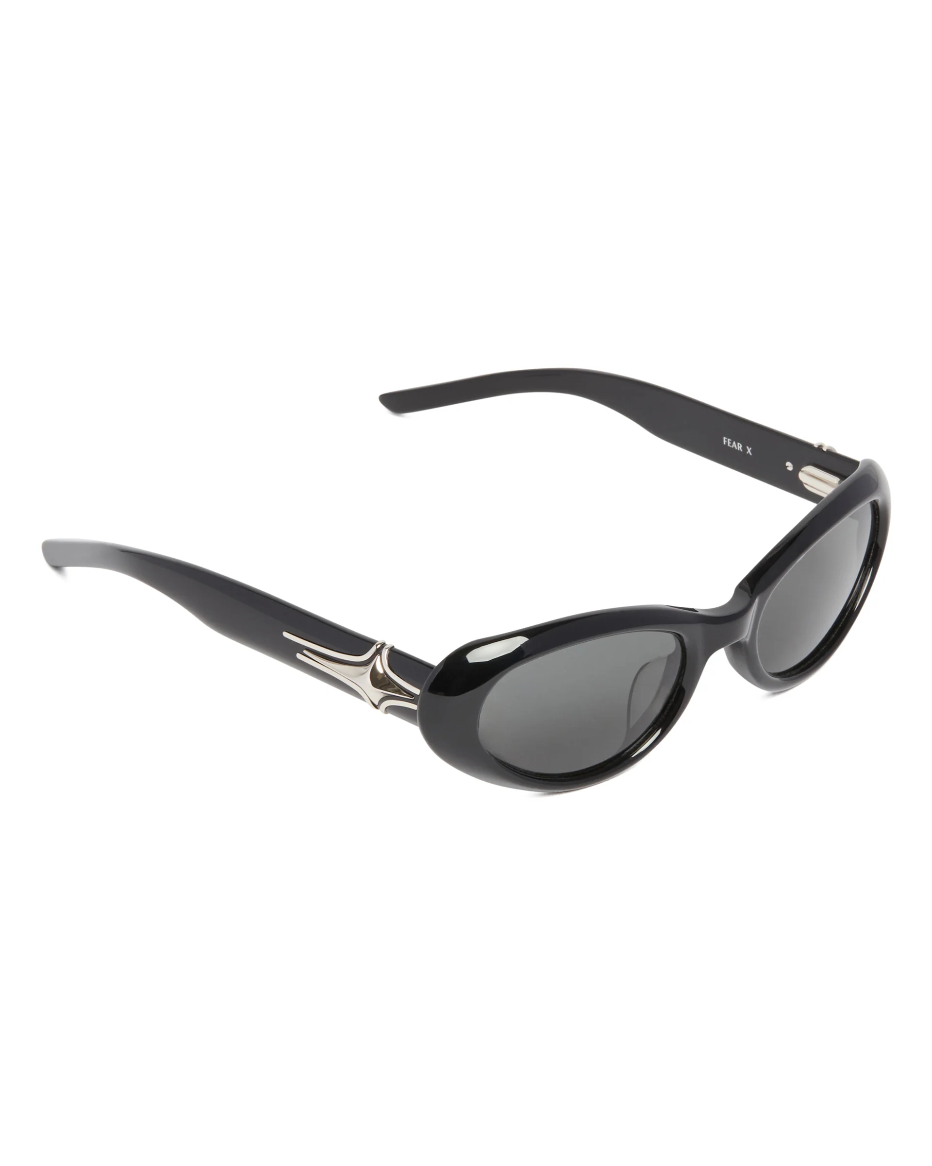 Occhiali Da Sole Fear X 01 Neri di Gentle Monster. Montatura in acetato nero, lenti nere e silhouette ovale. Astine con il simbolo distintivo della collezione Bold color argento.