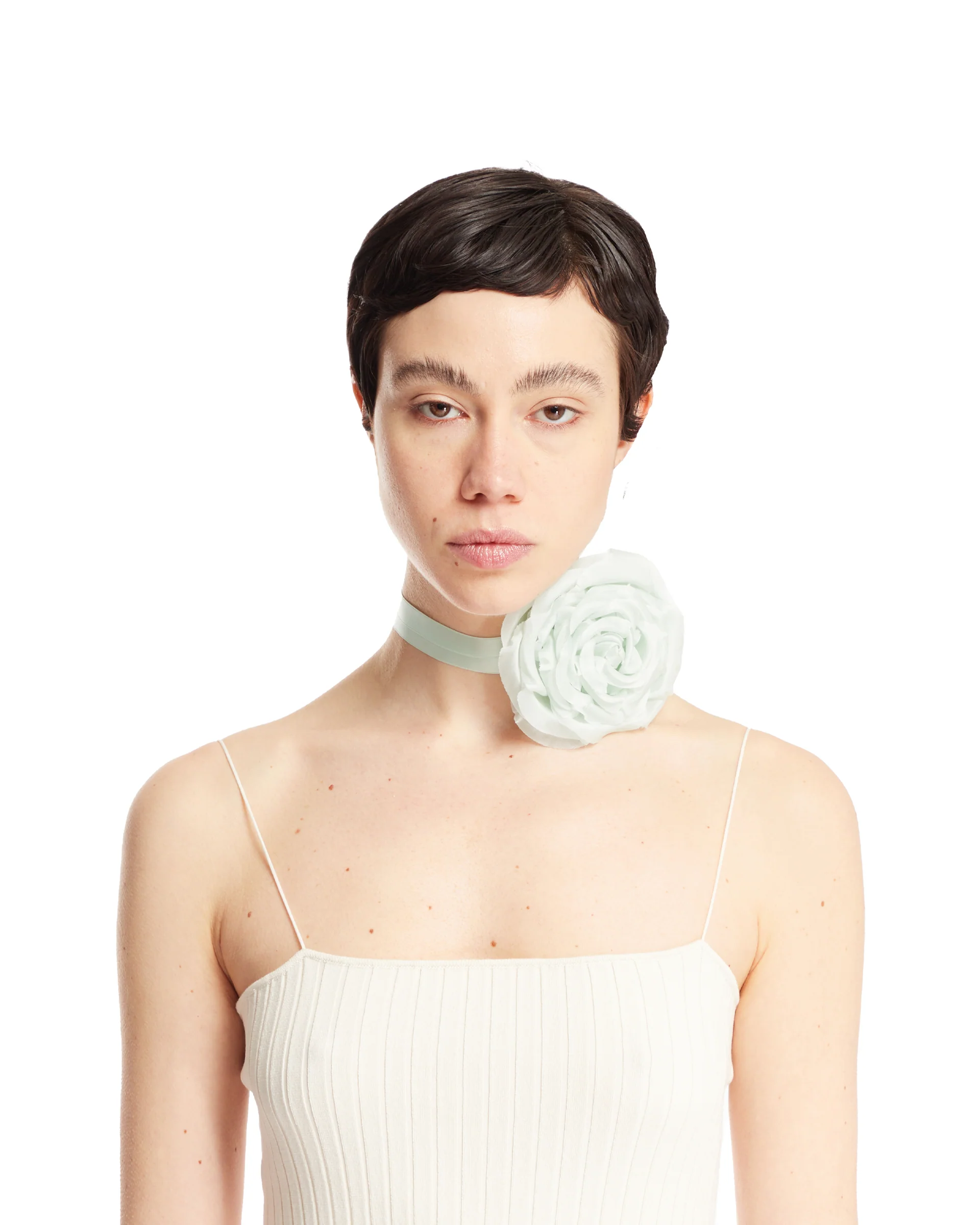 Choker Posy Verde In Seta di Jennifer Behr. Fiore realizzato in seta e organza verde menta con un finish velvet e nastro tono su tono. Ogni pezzo è unico e fatto a mano.