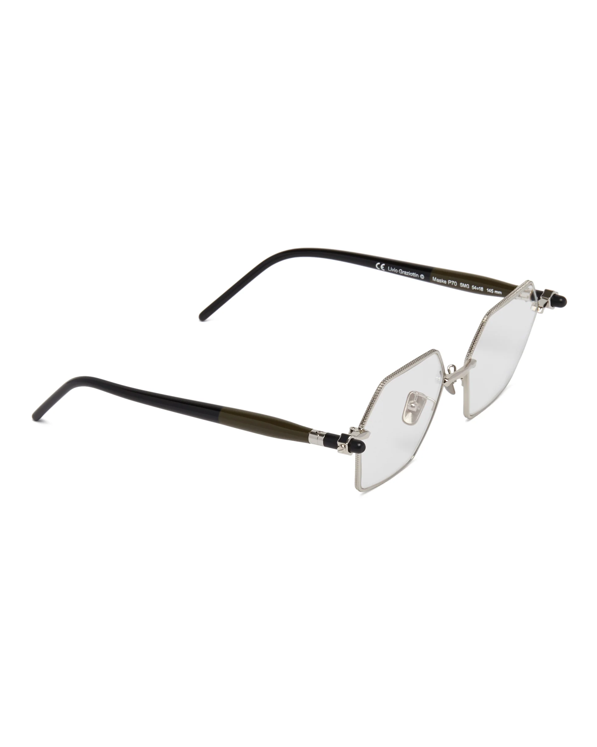 Occhiali Da Sole P70 Mask Argentati di Kuboraum. Montatura in metallo argentato con dettagli a contrasto. Forma esagonale, lenti tinte, naselli mobili, dettagli logati allÂ’interno della stanghetta.