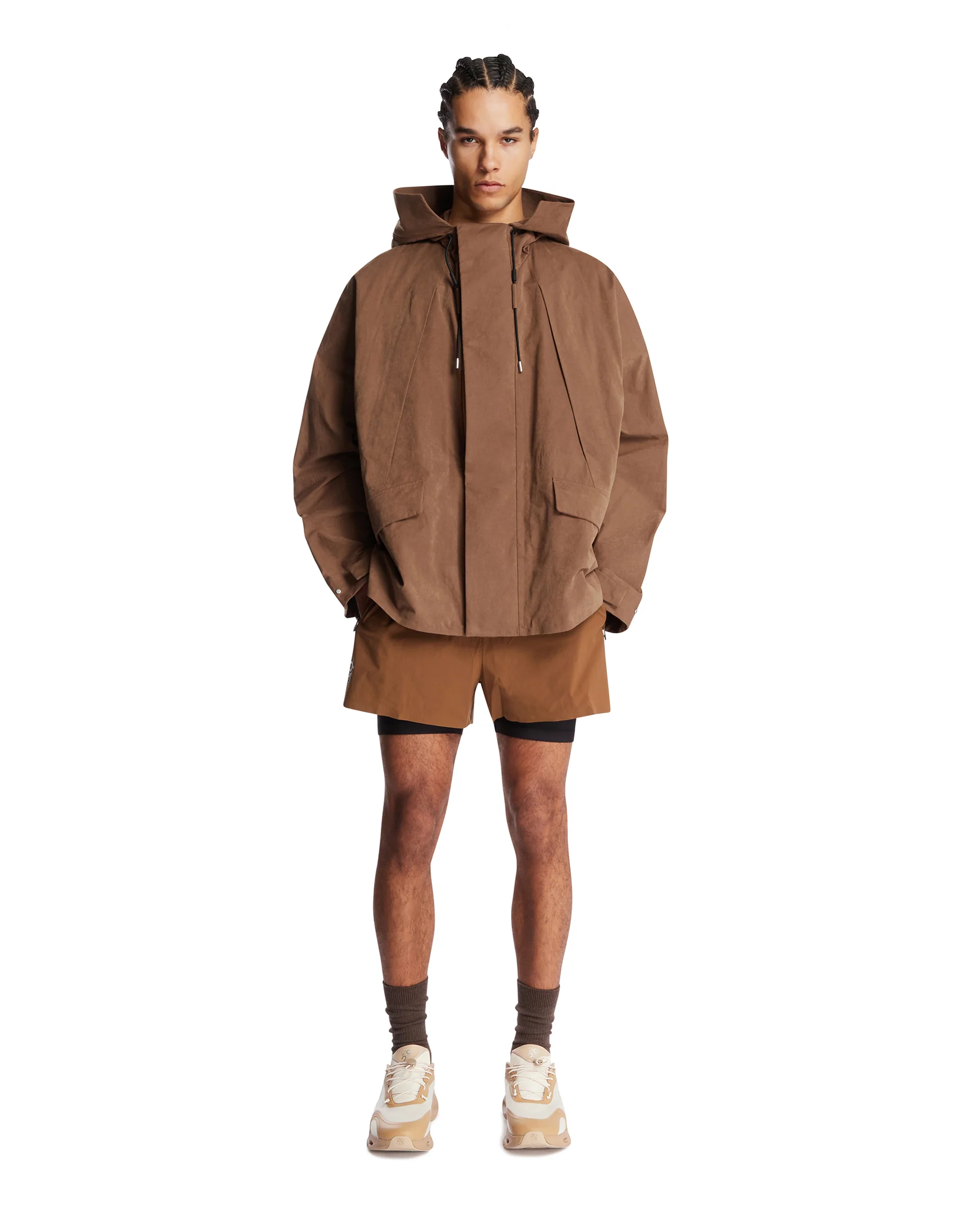 Giacca Tecnica Con Cappuccio Marrone di LOEWE x On. Realizzata in tessuto tecnico marrone, imbottitura in tessuto tecnico, cappuccio regolabile con cordini, chiusura frontale nascosta con zip e patta antivento, ampie tasche frontali con patta obliqua. Polsini con strap regolabile, fondo dritto, vestibilità rilassata. Thiago è alto 185 cm e indossa una M.