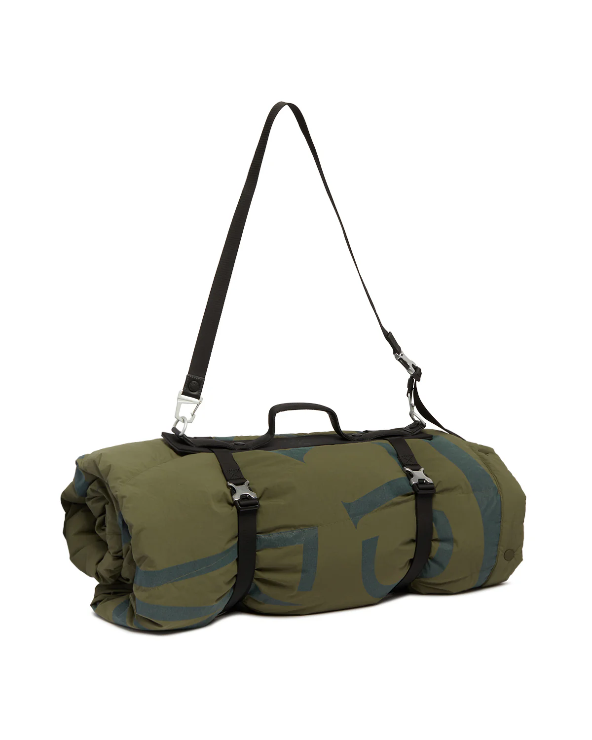 Coperta Piumino Imbottita Verde Con Logo di Moncler Genius x Pharrell Williams. Nylon verde, imbottitura in piuma, stampa con maxi logo. Manico sulla parte superiore, tracolla staccabile, hardware color argento e Chiusura con bottoni.