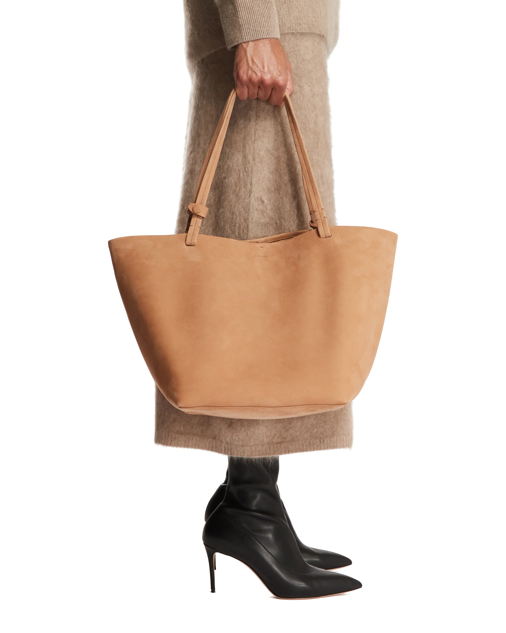 Park Tote Three Beige di The Row. Pelle scamosciata beige, chiusura interna, manici piatti e laccetto interno con tracolla regolabile. Fodera in pelle. Dimensione (cm): 45X30X26