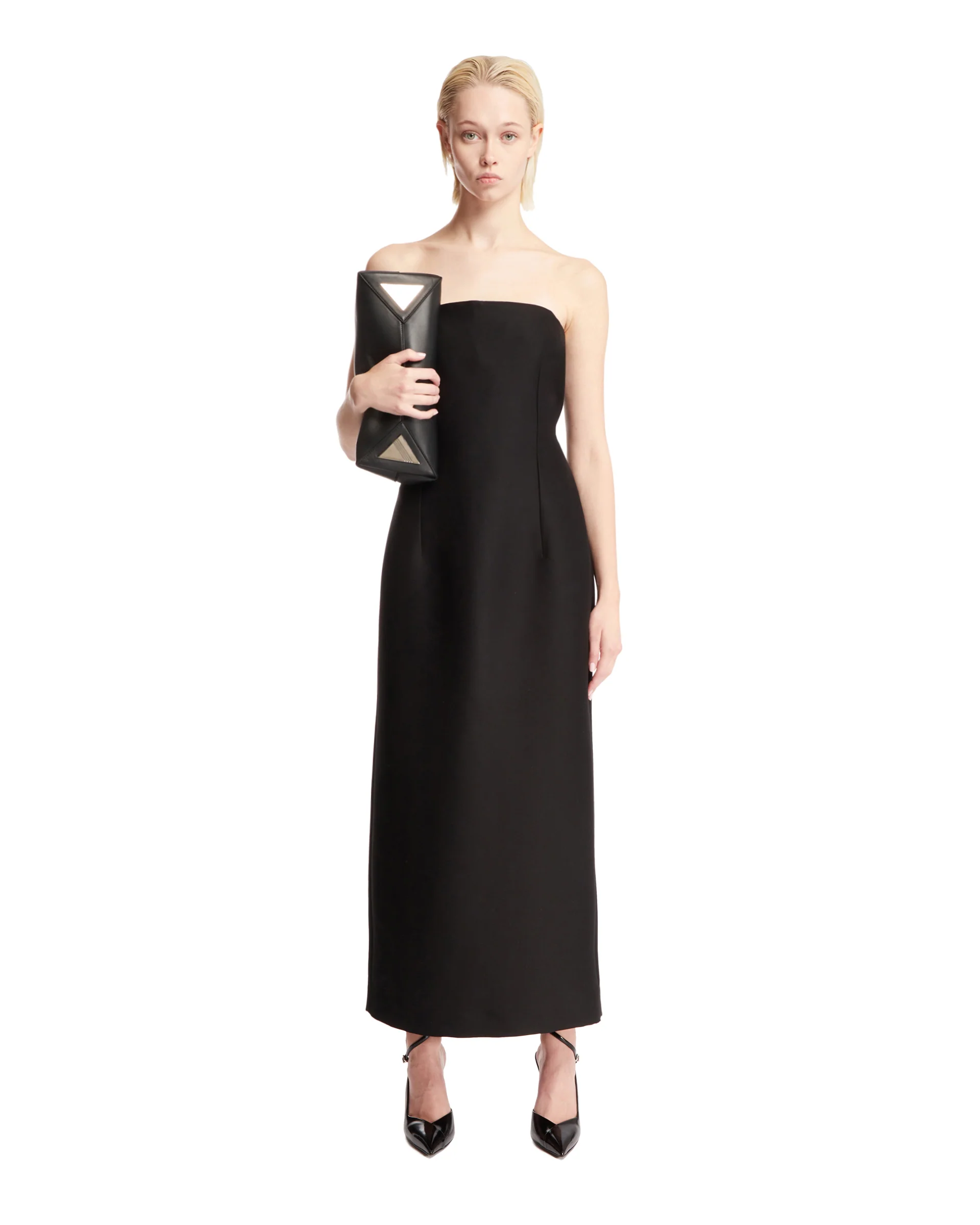 Abito Ward Nero di The Row. Realizzato in misto lana vergine e seta nera. Scollo dritto, senza bretelle, silhouette avvitata, spacco posteriore, chiusura con zip invisibile sul retro, orlo dritto, fodera in seta. Greeta è alta 172 cm e indossa una 4.